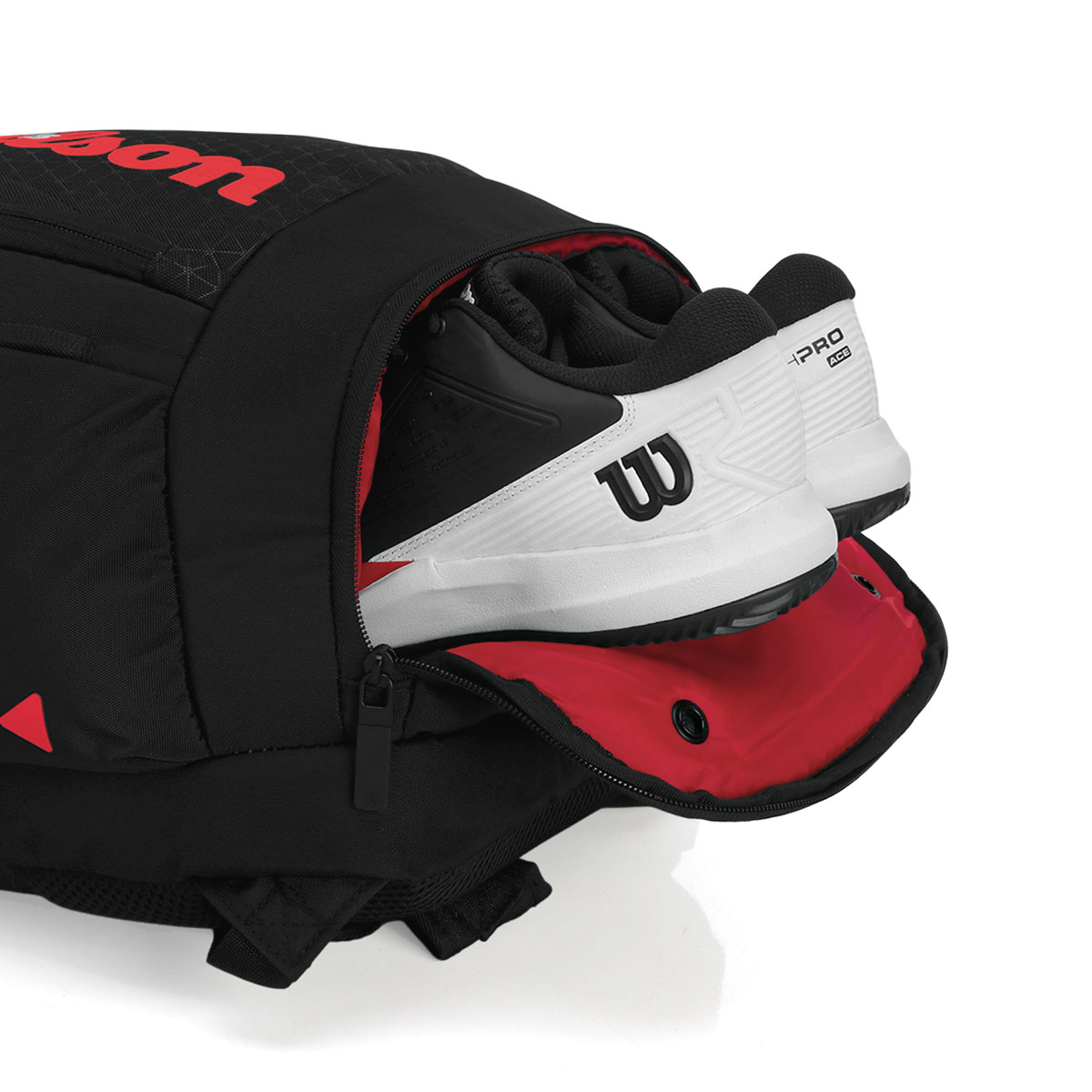 Mochila Wilson Clash V3 Super Tour Preto e Vermelho, oferece a organização ideal para quem busca praticidade e estilo. Com espaço para transportar até duas raquetes e itens essenciais, ela proporciona conforto e segurança, garantindo que seus objetos estejam sempre organizados e protegidos, seja durante o treino ou nas competições.