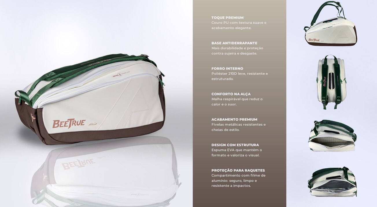 Raqueteira oficial do modelo Classic Bee da AMA Sport; ideal para quem quer guardar e transportar suas raquetes de beach tennis com estilo e proteção.